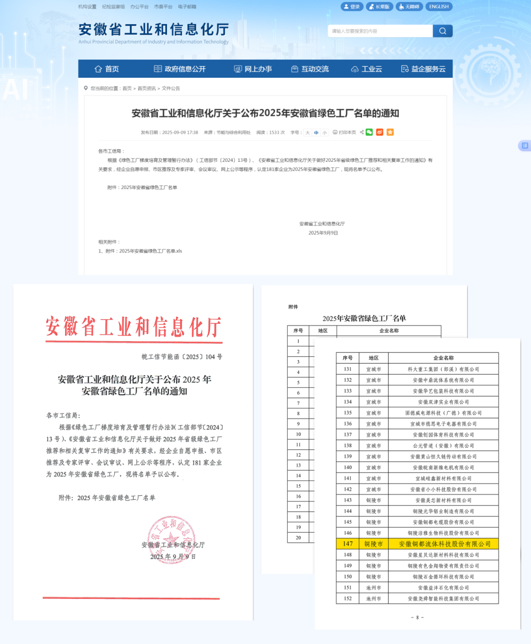近日,安徽省工業(yè)和信息化廳正式公布2025年安徽省綠色工廠名單,銅都流體憑借低碳生產、綠色制造等方面的卓越表現成功入選。